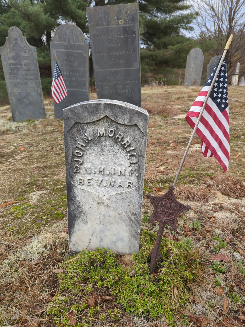 John was the son of Micajah and Priscilla (Whittaker) Morrill. John had 2 brothers; David and Samuel. John's paternal line has been documented back to Richard Morrill, born 1566 in England, to Richards's son the first Morrill immigrant to America, Abraham Morrill, born 1586, Hatfield, Broad-Oak, Essex, England who immigrated in 1632 on the Lyon.