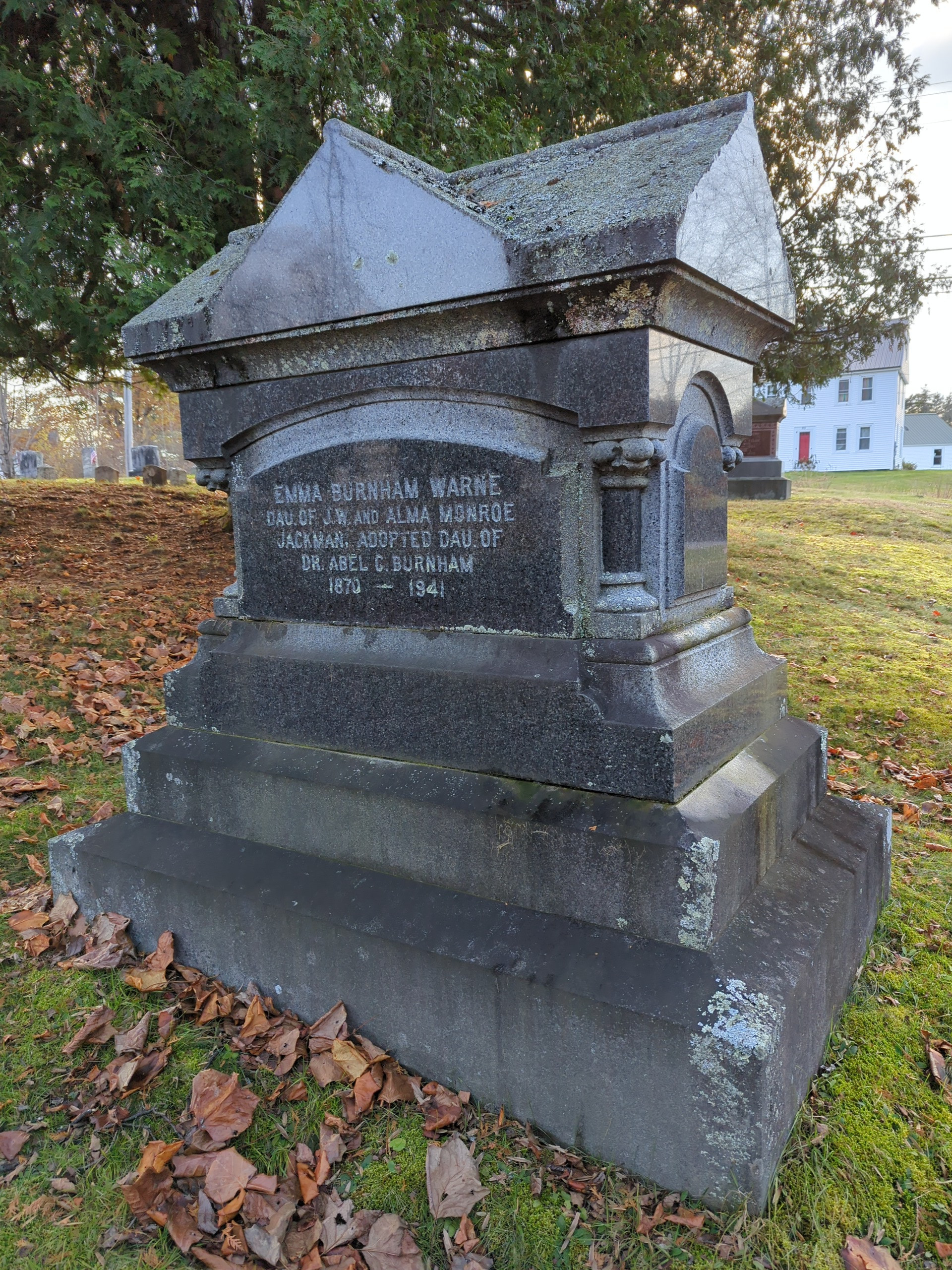 -Dau of John & Alma (Monroe) Jackman, adopted by Dr. Abel Burnham after the death of her mother.