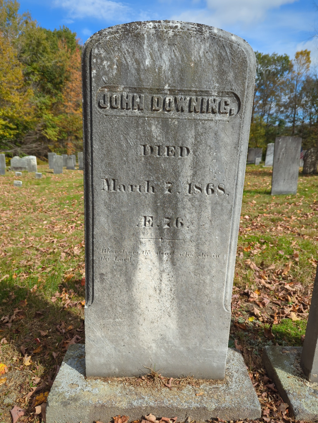 His own will, dated 3 March 1868, stated that he was "weak in body." It mentions his wife and brothers Joshua, Stephen C., and Peter Downing. It was probated at Manchester, New Hampshire on 22 March 1868 [Hillsborough Co., N.H., Probate No. 1688, 1868].