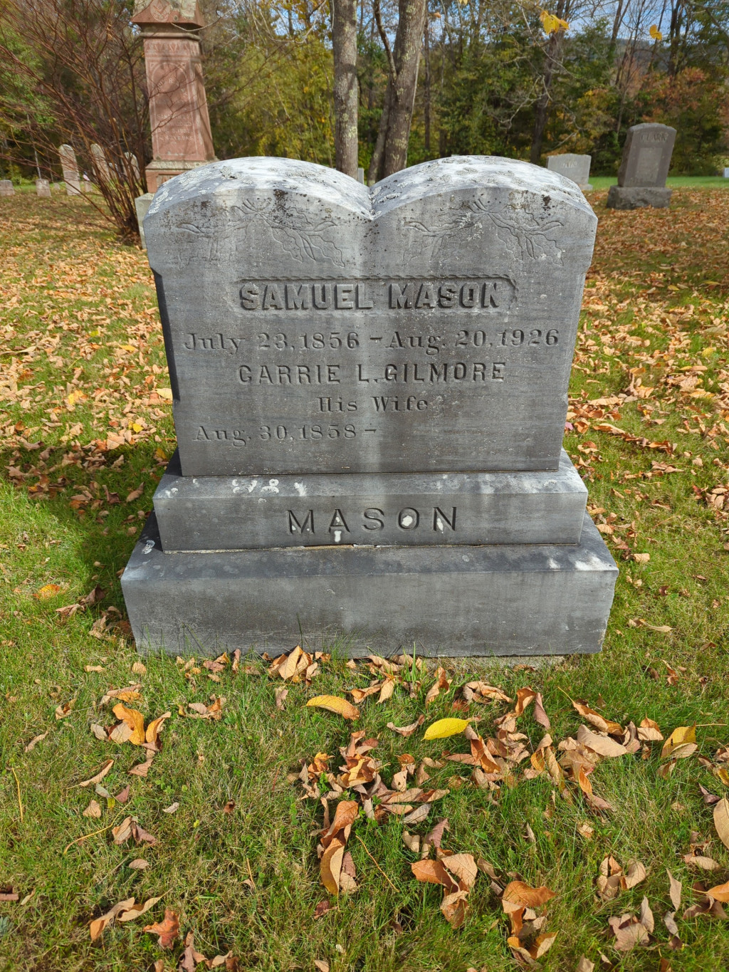 Married to Carrie L. Gilmore, unable to find her DOD or if she is buried with Samuel. in 1930 she was in Massachusetts living with son Frederick (b. 1884)
