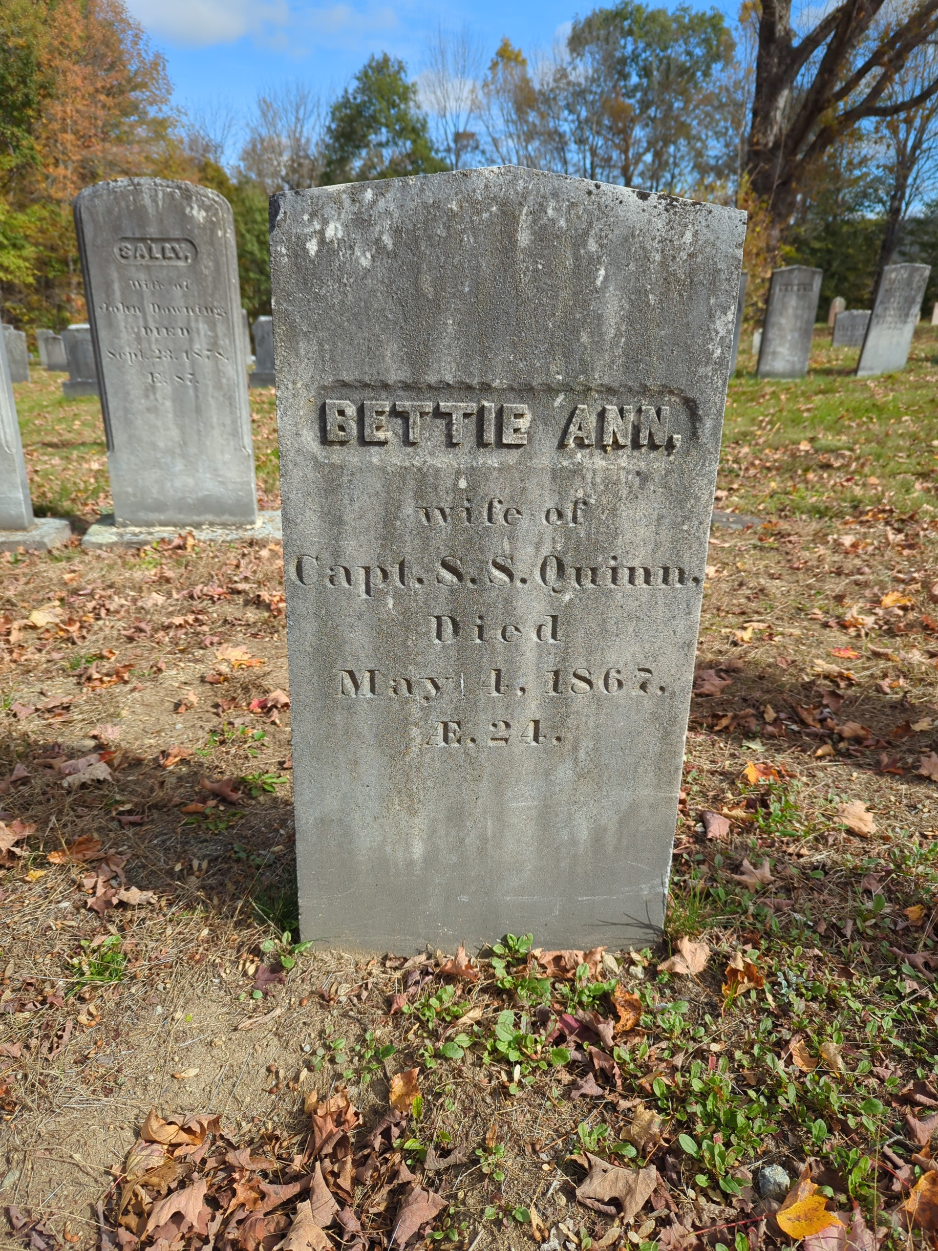 BETTIE ANN Wife of Capt. S.S. Quinn. Died May 4. 1867 Ae. 21